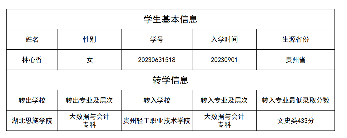 经学生申请,学院审核,校委会决议,同意林心香同学的转学申请,现将该生信息进行公示: