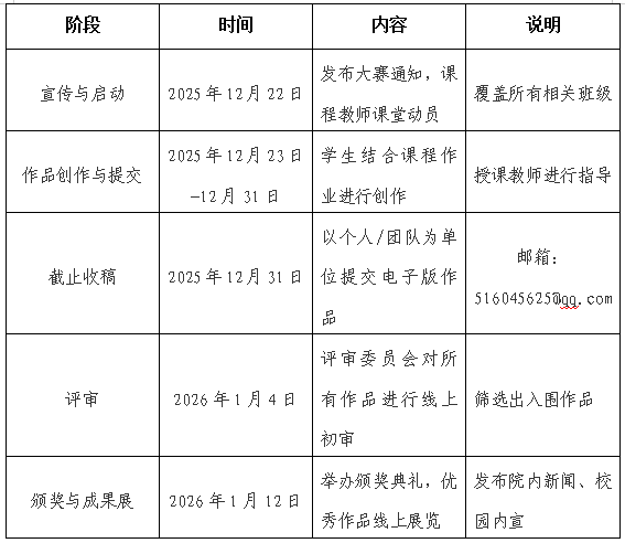 所有文件以“专业-姓名-学号-作品名”格式命名,作品投稿:12月31日24:00前,参赛个人/团队按要求完成投稿至邮箱516045625@qq.com,逾期视为自动放弃。